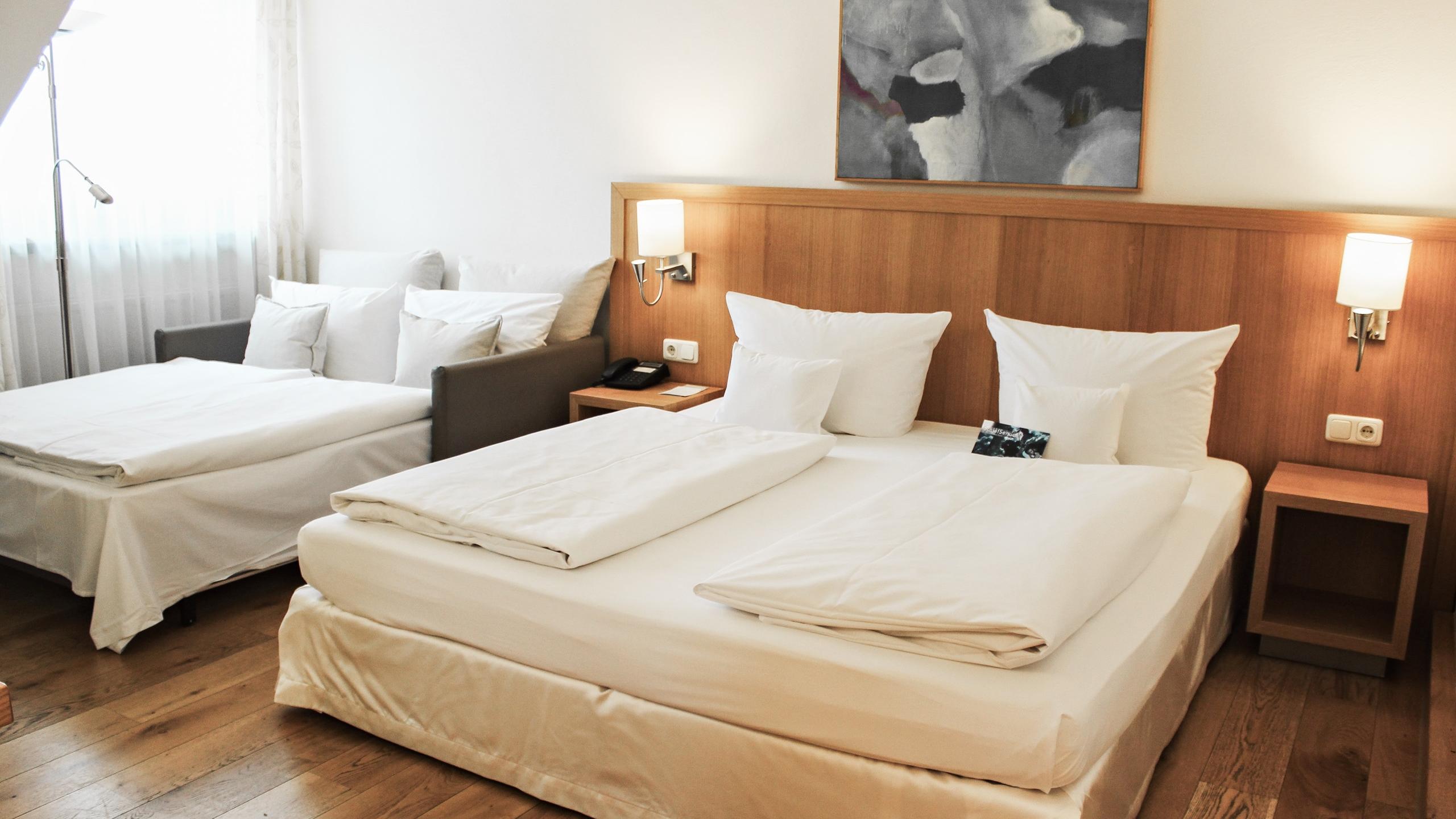 Spread out as you please, with the whole family: our family rooms (20-25 sqm²) are a perfect vacation home. Parents enjoy a restful sleep in the spacious double bed (180 x 200 cm), the children slumber in the comfortable sofa bed or récamiere (120 x 200 cm). Our individually designed family rooms are located either in the main house near the restaurant or in the garden house near the pools. Also for the small hunger in between there are family rooms with pantry kitchen on request and availability.